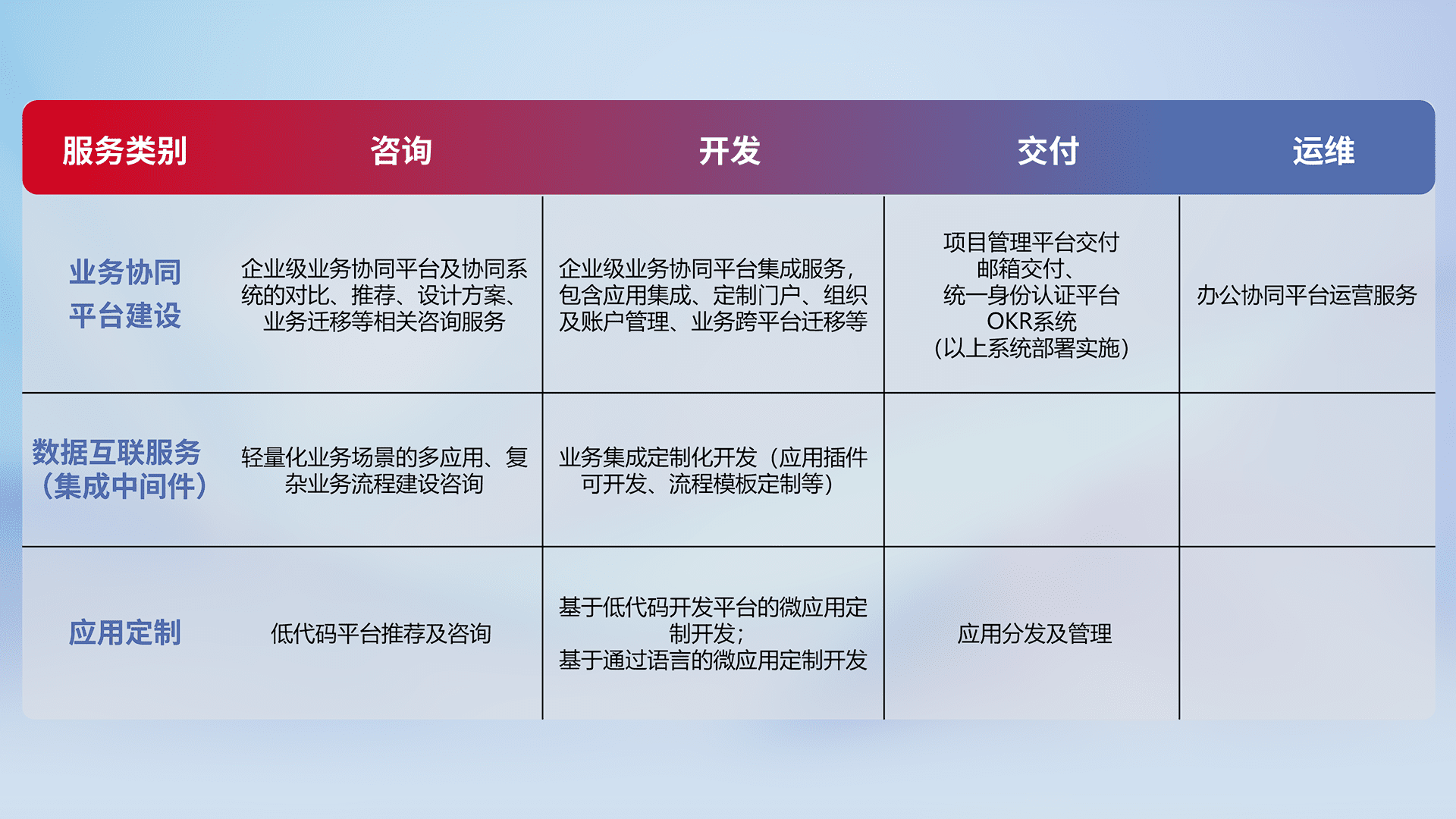 针对钉钉、、、企微、、IDaas等平台级产品提供产品的规划、、方案、、、交付、、、定制化开发等服务,,,实现如统一协同办公、、智能客户服务、、、混合会议管理、、、智能数据查询、、等业务场景,,实现数字化转型。。。